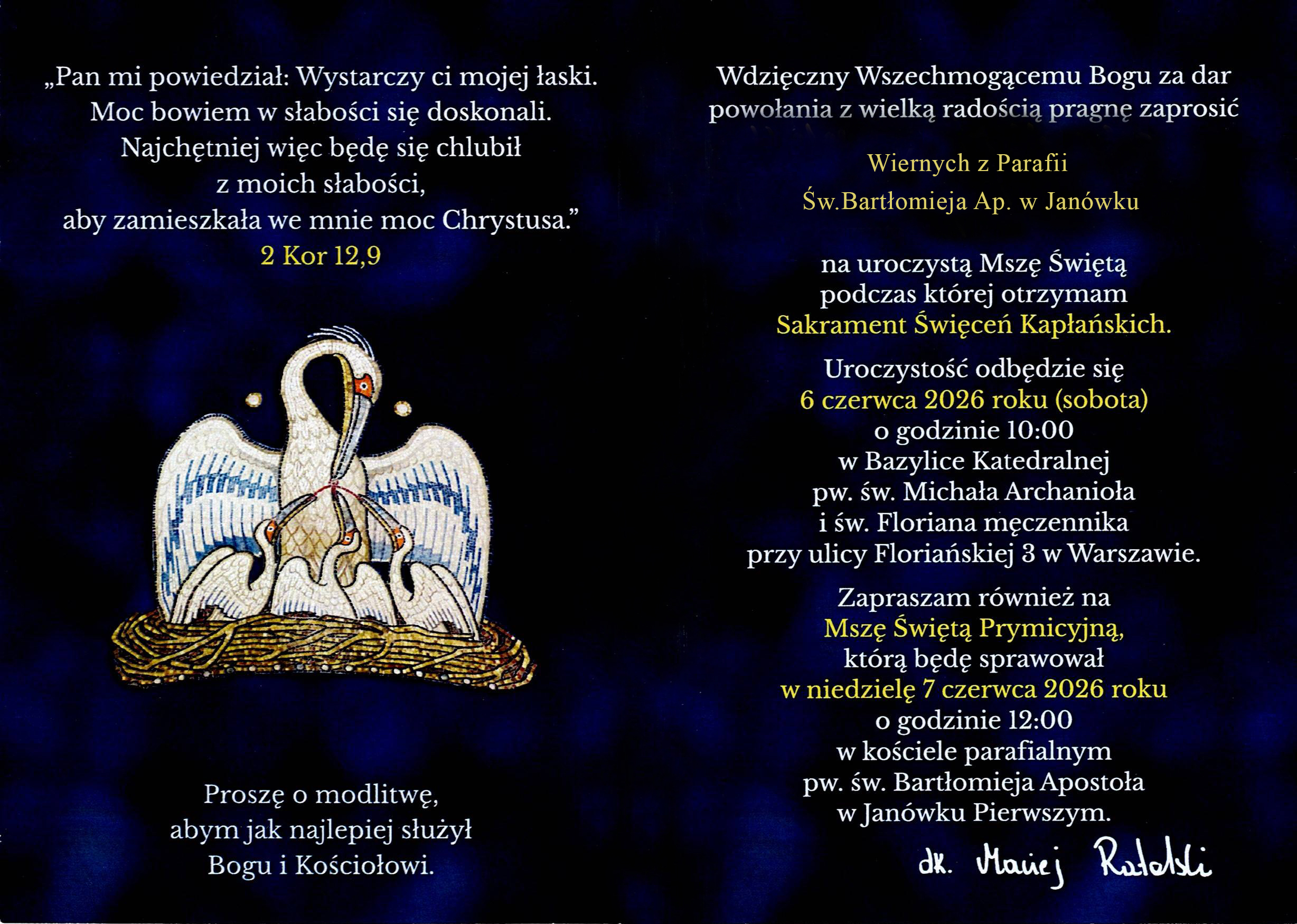 Z wielką radością i wdzięcznością wobec Boga pragniemy poinformować, że nasz parafianin, diakon Maciej Rafałski, przyjmie sakrament święceń kapłańskich w dniu 6 czerwca 2026 roku (sobota) o godzinie 10:00 w Bazylice Katedralnej pw. św. Michała Archanioła i św. Floriana Męczennika przy ul. Floriańskiej 3 w Warszawie.